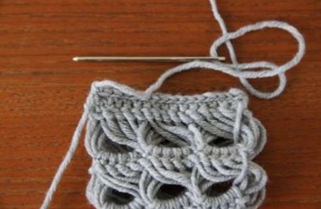 This type of crochet pattern is called a “broomstick lace” pattern. It’s the work of the hand of crafter Kootoyoo. There are a lot of patterns and tutorials available to learn how to do basic crochet stitches such as the those involved in broomstick lace patterns. But here’s one tip: Use your knees, that’s what Kootoyoo says. She braces the needle between her knees / thighs to make managing the needle and hook easier.